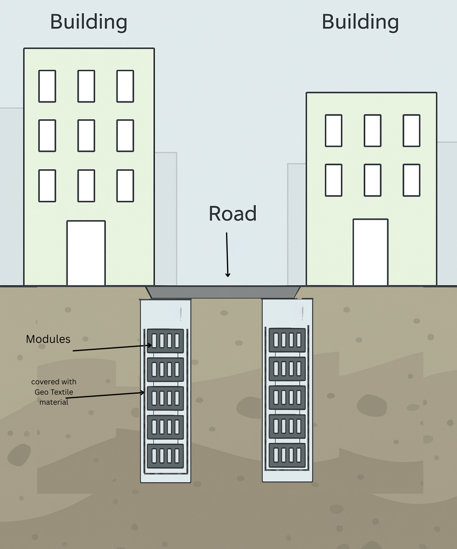 The Smart EnviroModule (SEM) units are securely covered with Geo-Textile material and installed below ground level. The system is embedded under compacted soil to ensure long-term stability and filtration efficiency.