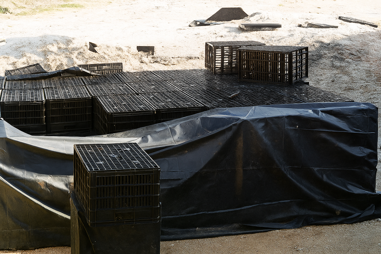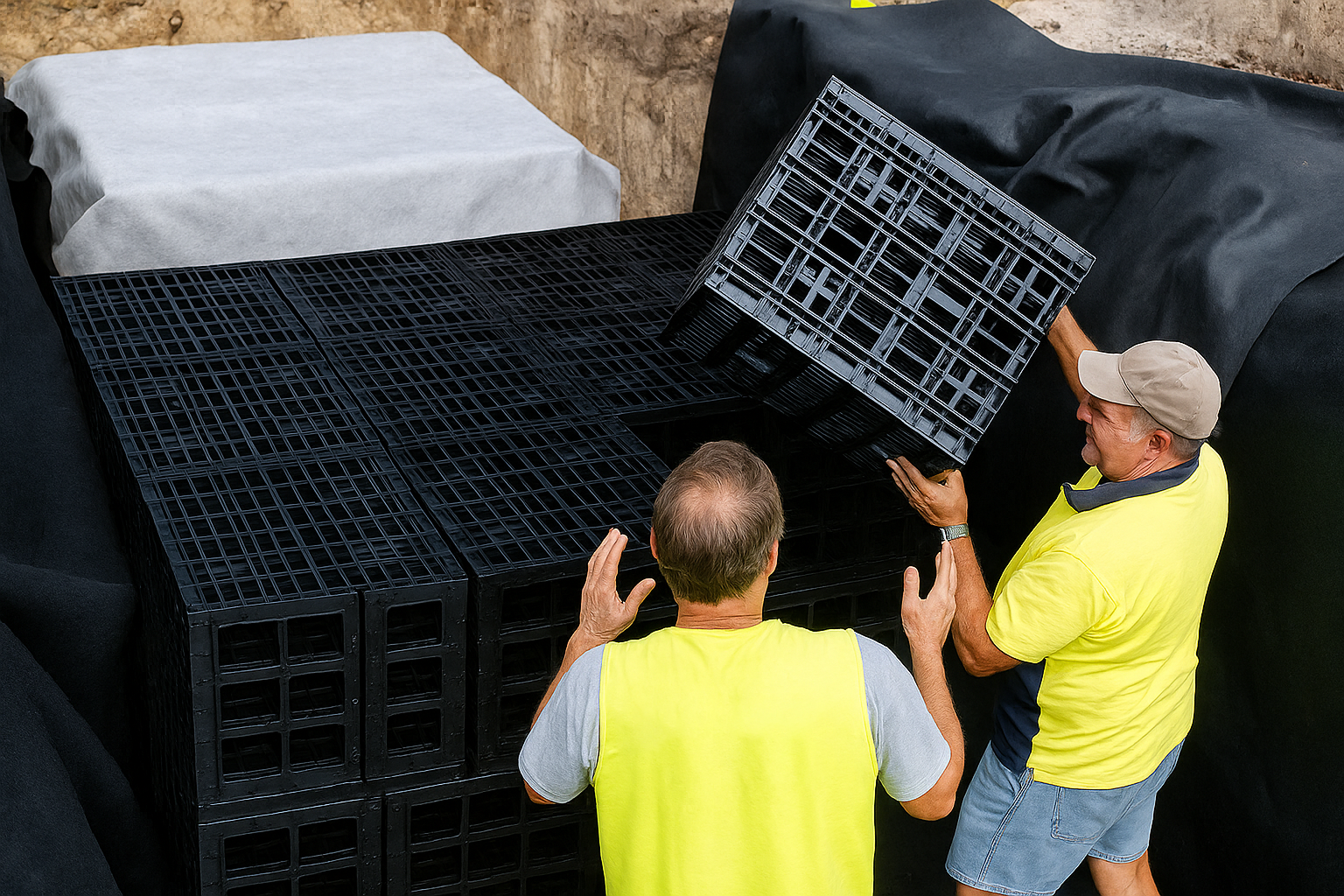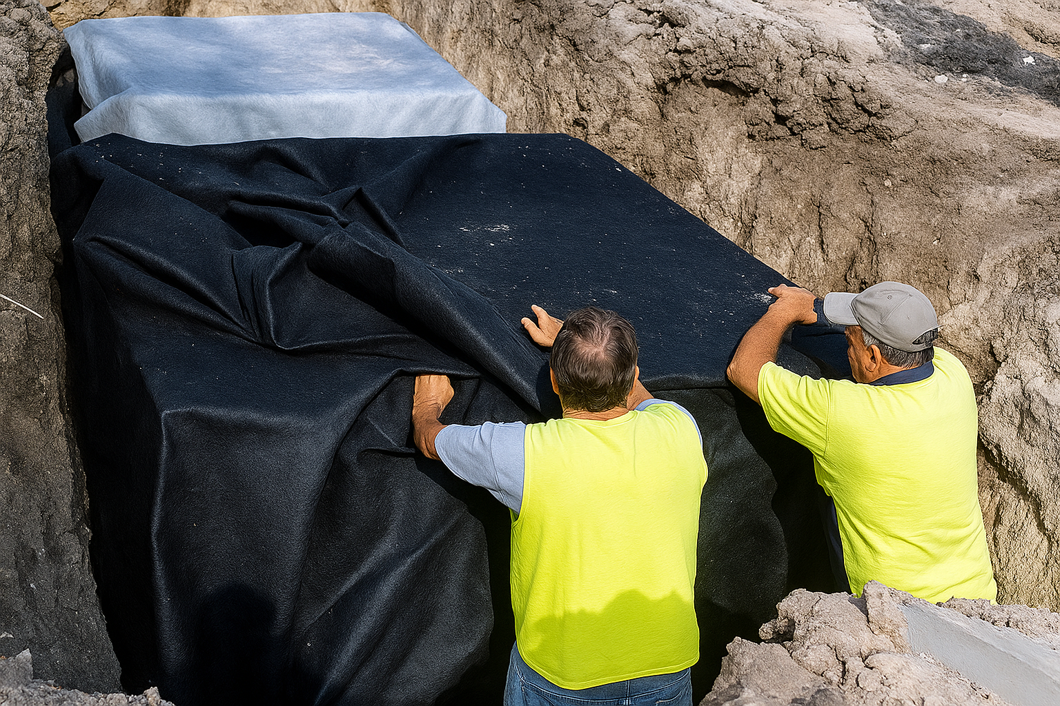 SEM installation also requires the use of porous geotextile material for filtration applications and non-porous geotextile material for water harvesting and storage applications.