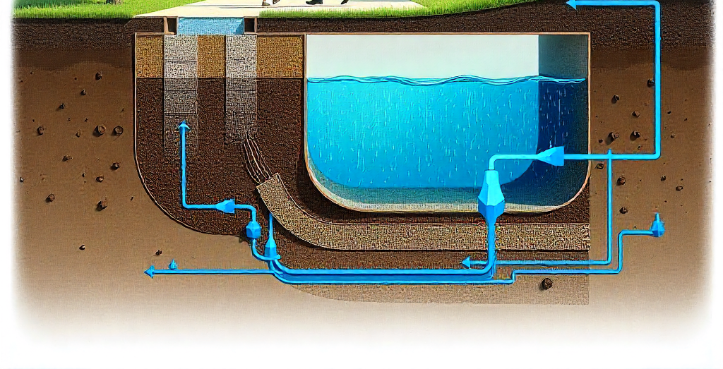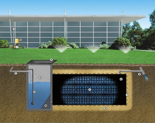 Downpipe 1 .Inlet pipe 2 .Discharge control pit 3 .Lockable lid/grate 4 .EnviroModules 5 .Welded tank liner 6 .Protection fabric 7 .Overflow pipe 8 .Coarse sand backfill 9 .Maximesh screen 10 .Suction line 11 .Above ground pump