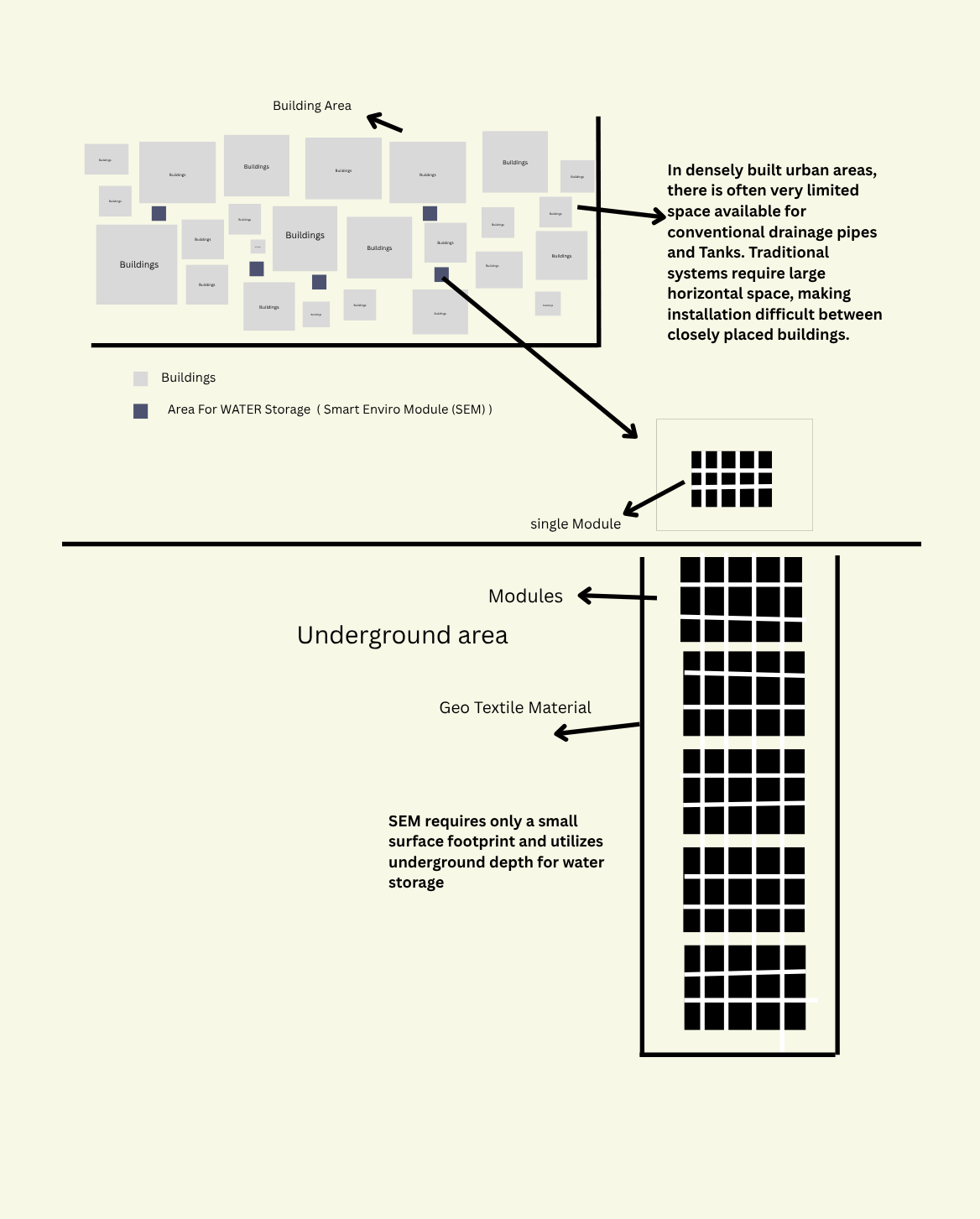 The Smart EnviroModule (SEM) revolutionizes stormwater drainage and storage by offering a modular, lightweight, eco-friendly, and economically efficient alternative to conventional systems. It eliminates heavy manufacturing, simplifies installation, reduces transport difficulties, and allows flexible underground water storage for reuse — making it a smarter, sustainable, and future-ready solution.